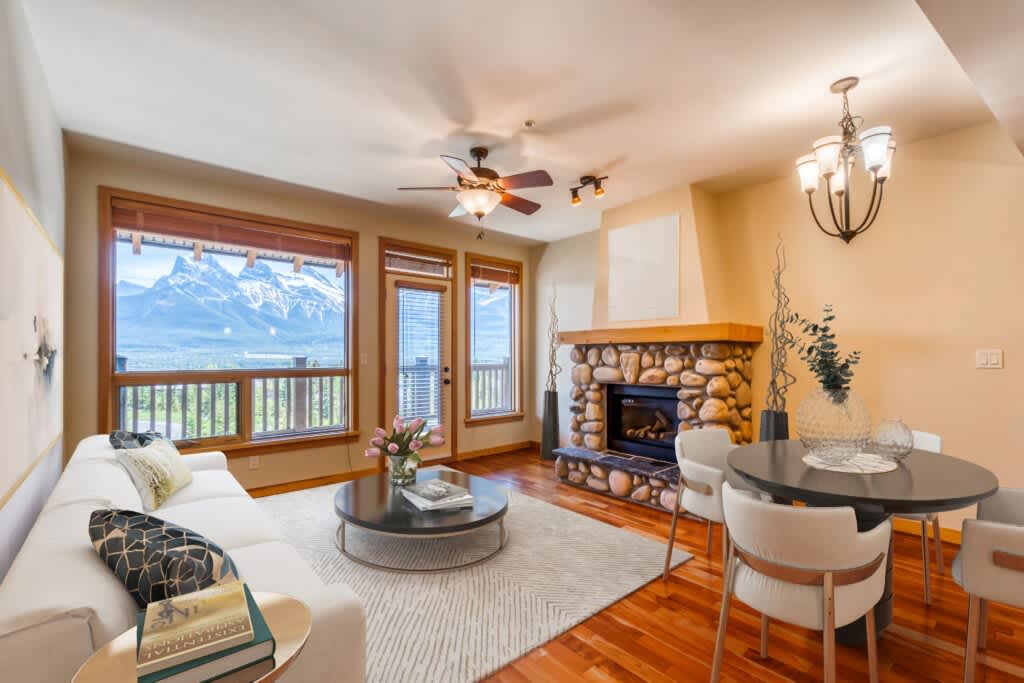 We are pleased to announce the sale of this south-facing condominium with spectacular views of the Three Sisters. With 2 bedrooms plus a den, the well-thought-out design separates the bedrooms on either side of the open-concept living space, creating privacy for friends and guests. The den is an ideal home office, TV room, or additional guest space. Enjoy the large, covered deck with panoramic views of the Bow Valley and mountains. This home boasts ample storage both in the unit and two additional storage spaces: in the locked storage room and in the parkade. There are two title parking stalls with elevator access making this a great low-maintenance mountain retreat. Situated in the community hub for Eagle Terrace and Cougar Creek, there are restaurants, cafes, and shops at your doorstep. A paved path leads you to Downtown Canmore or explore the walking and biking trails from your front door. If you are interested in finding your mountain home in a vibrant community, please contact Laura or Christopher.