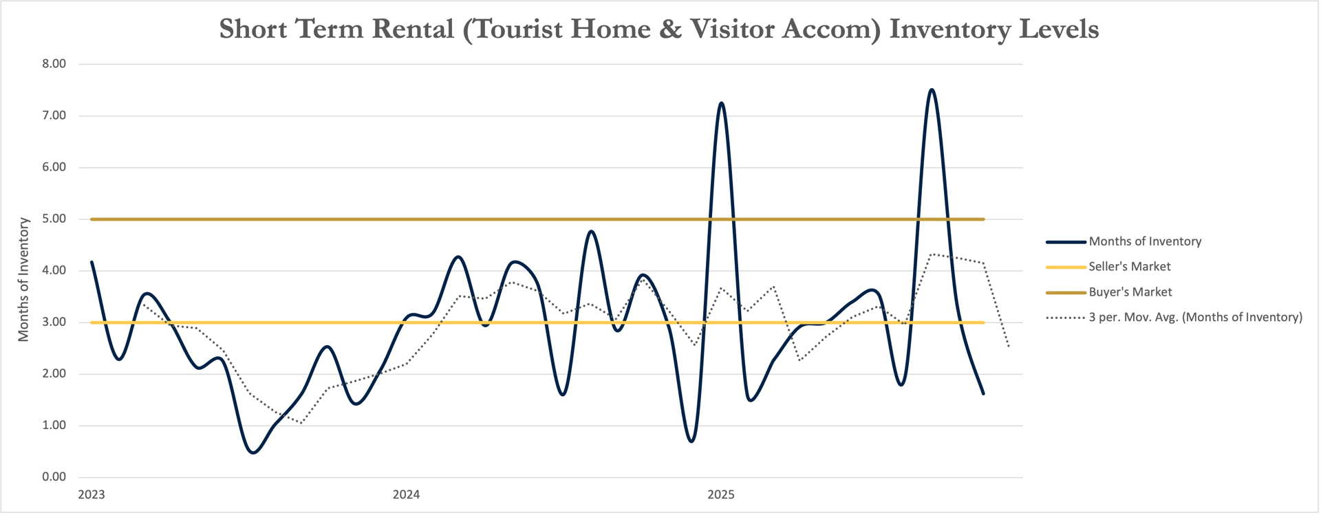 The STR market—tourist homes and visitor accommodation units—saw another decline in inventory this month. Despite the seasonal slowdown, this segment remains in a seller’s market, supported by strong tourism demand, stable rental revenue expectations, and continued investor interest.