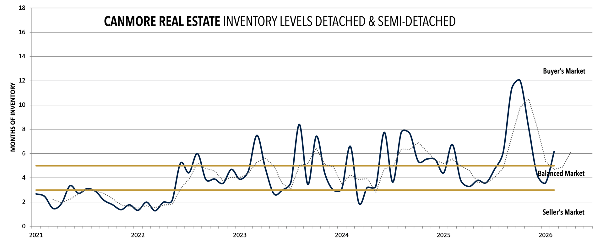 Detached homes in Canmore currently sit closer to a balanced to buyer’s market, depending largely on location, price point, and property condition.