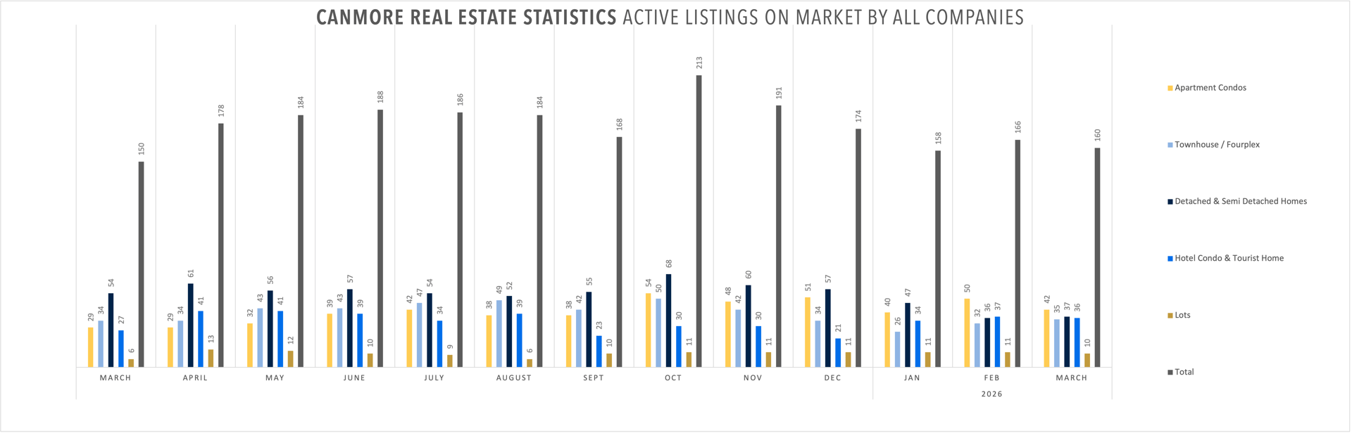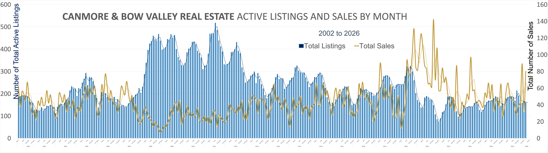 Historically, the spring months bring increased listings and sales activity in the region, as warmer weather and improved market visibility encourage both buyers and sellers to re-enter the market. This seasonal pattern has been a consistent trend in the Bow Valley for many years, with demand often quickly absorbing new listings due to the area’s limited land supply and continued appeal as a lifestyle destination.