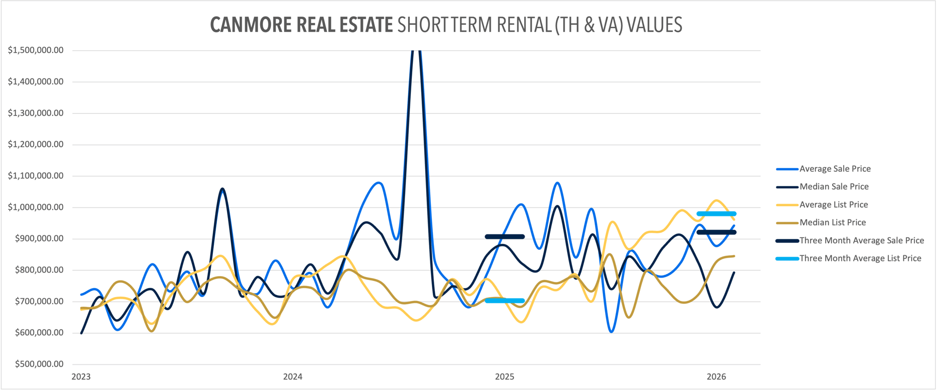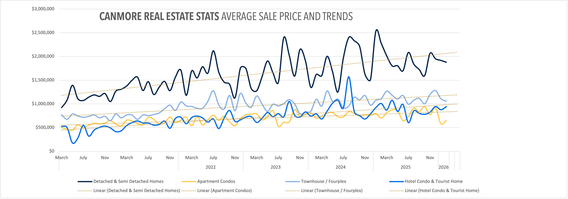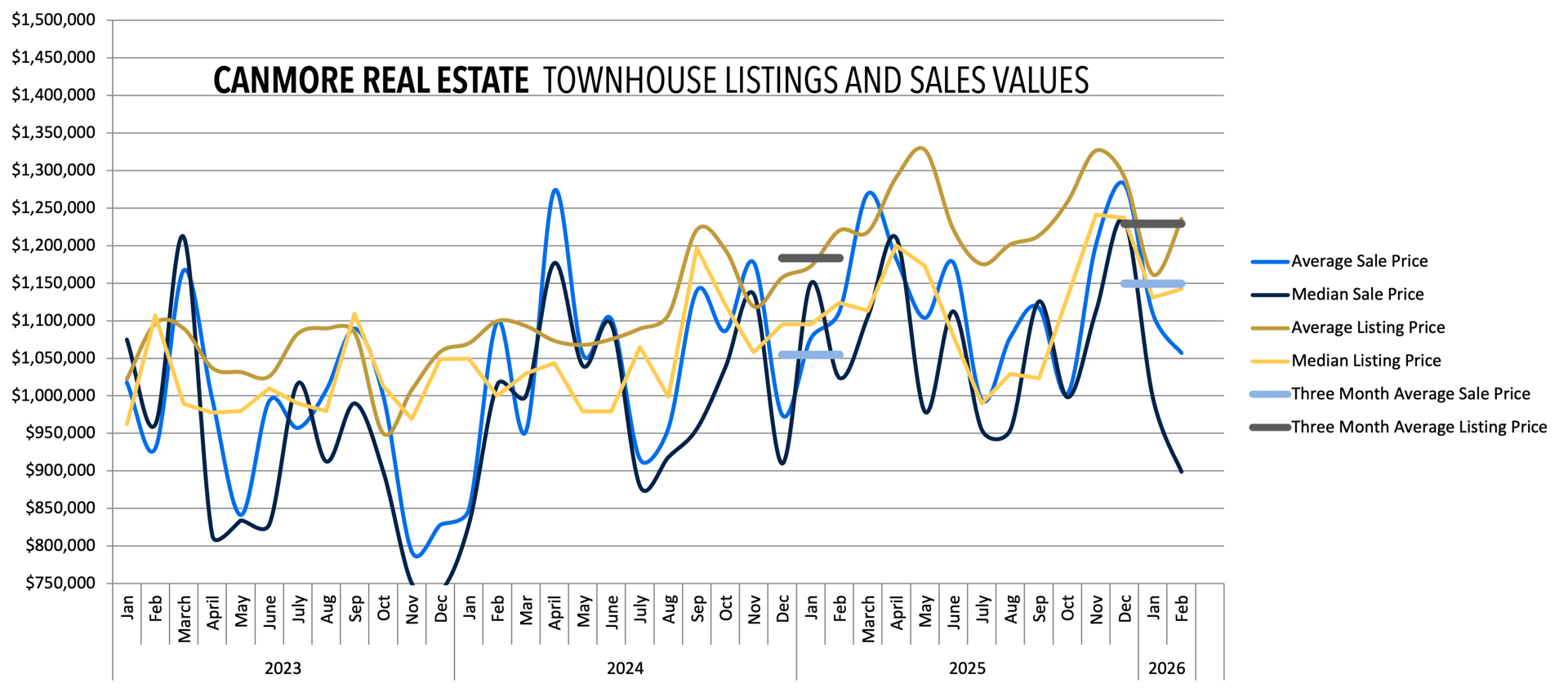 Townhomes continue to perform strongly in the Canmore market, with the three-month average sale price reaching $1,149,450, representing an increase compared to 2025.