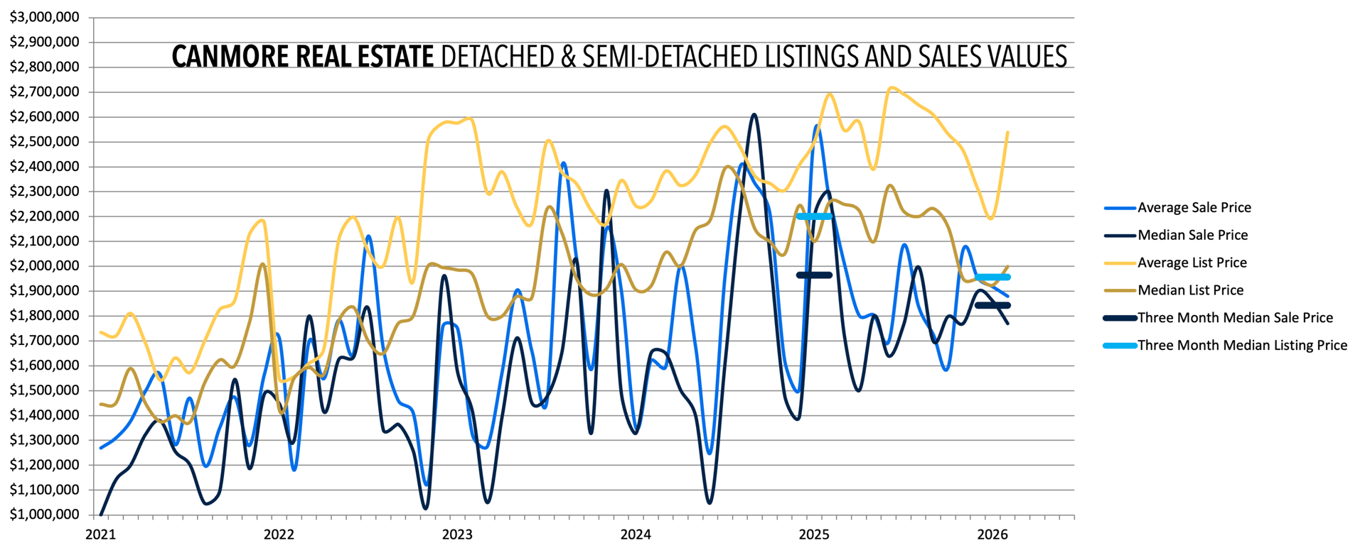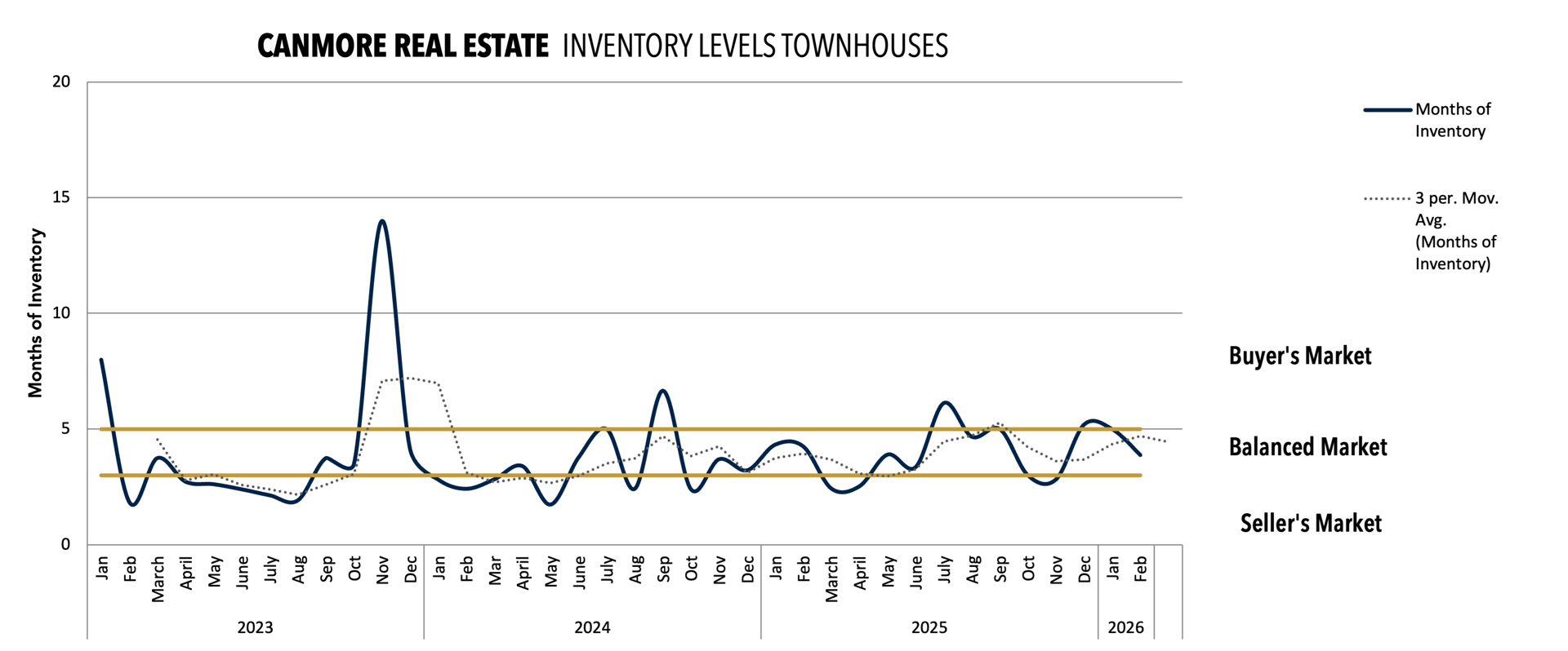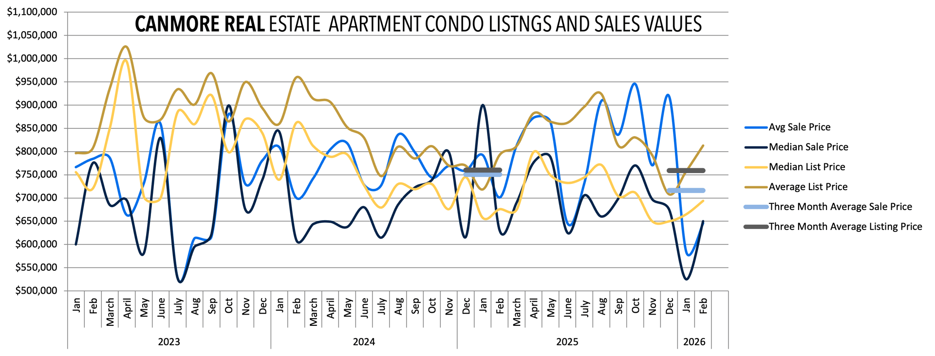 Townhomes continue to perform strongly in the Canmore market, with the three-month average sale price reaching $1,149,450, representing an increase compared to 2025.