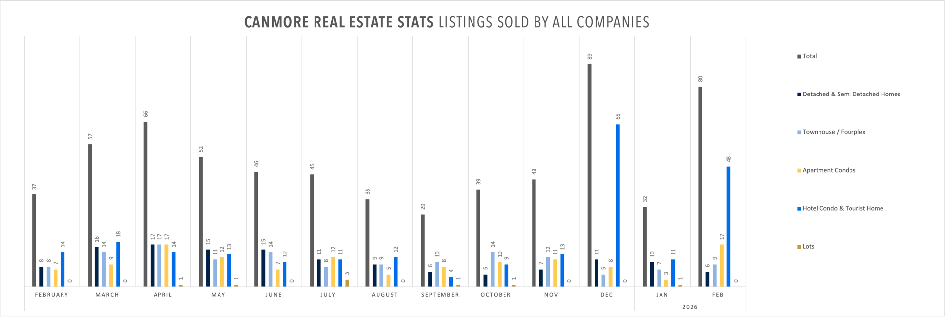 The Canmore and Bow Valley real estate market is beginning to transition into the spring season, and early indicators suggest a noticeable increase in activity. After a slower start to the year in January, February sales rose across several segments of the market, highlighting renewed buyer confidence as more inventory begins to appear.