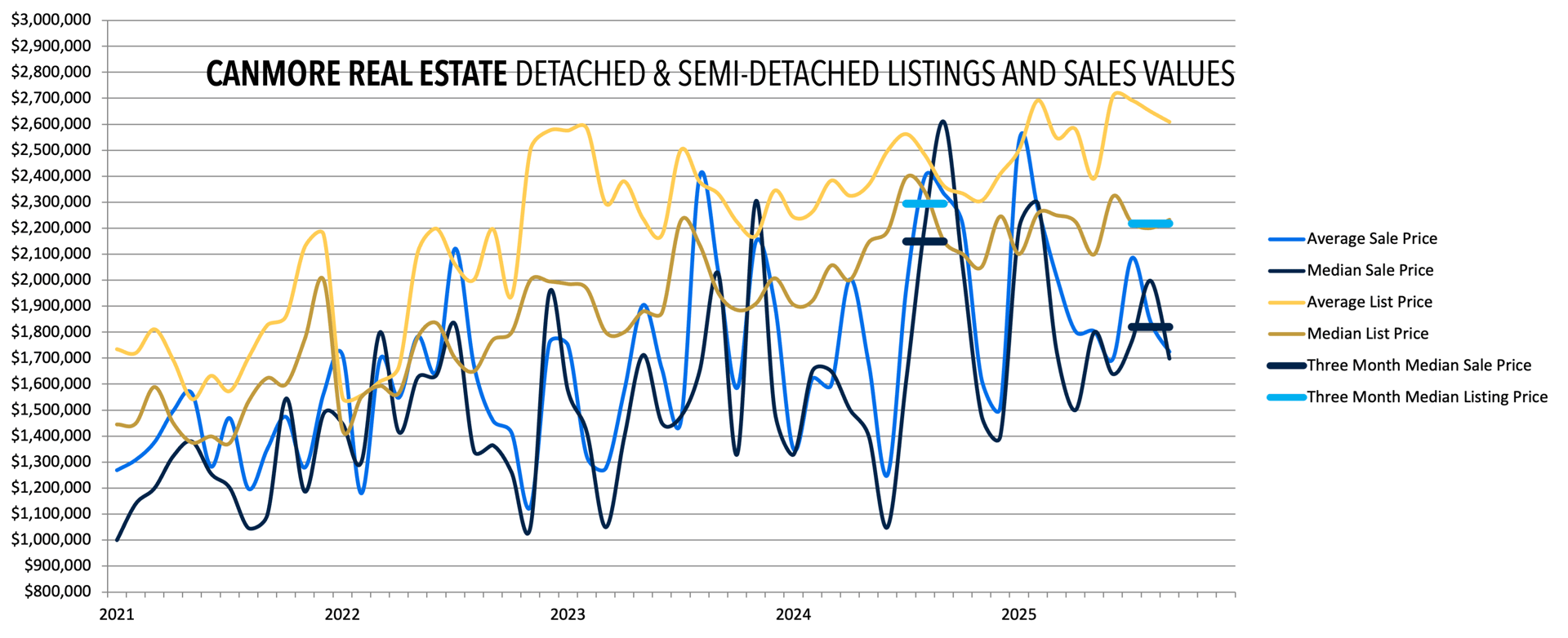 Detached and semi-detached homes have been the backbone of the Canmore market for years, but rising inventory is changing the balance. With 68 listings in October and only six sales in September, buyers now have more negotiating power. Median pricing in Q3 landed at $1,728,000, down from the highs we saw earlier in the year when detached homes regularly surpassed $2M.