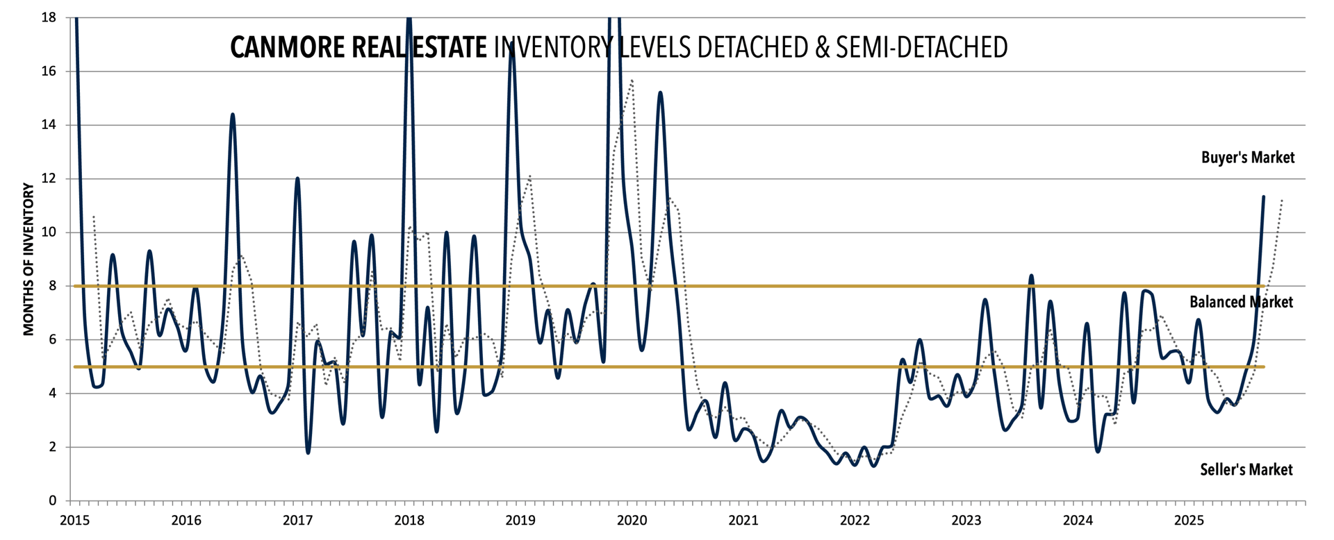As we step into October, the Canmore and Bow Valley real estate market is entering a new phase. For the first time since December 2020, the total number of active listings has climbed above 200 — reaching 213 properties including lots. This milestone is reshaping the dynamics of our market, particularly in the detached and semi-detached segment, which has now shifted into buyer’s market territory.