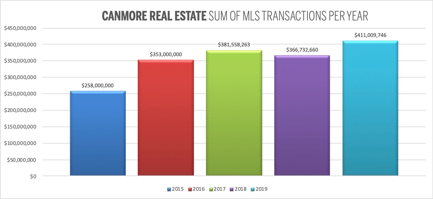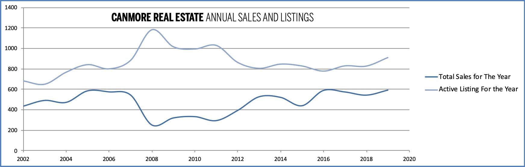 2019 sales were up again this past year to 592 MLS transactions, a 9% year-over-year increase. There are a couple of notes on this: there have been a number of new developments launched and pre-sold that were recorded on the MLS. There was also an office that had not previously reported sales on the MLS now reporting sales. In conjunction with the sales, there was a 10% increase in listings to 910 listings. Much of the increase in listings were new construction in the Stewart Creek area of Three Sisters and new construction in South Canmore. The total volume of MLS sales in Canmore, Exshaw, Harvie Heights, Dead Man’s Flats, and Lac Des Arcs in 2019 was $411,009,746 a 12% increase year over year.